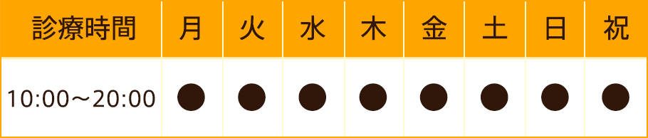 夜20時まで受付しており土曜、祝日も受付しておりますのでお仕事や学校で忙しくて中々時間がとれない方でも仕事帰りや土曜、祝日にご来院頂けます。